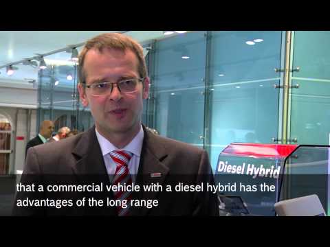 Bosch engineers are currently focusing on parallel-full-hybrid technology, in which the electric motor is positioned between clutch and transmission in the drivetrain, thus saving space. When driving long distances, electrical energy can be recuperated when driving downhill or braking, and temporarily stored in a high-voltage battery. The same applies to frequent stops and starts on delivery runs. When the truck drives uphill or starts off, this energy drives an electric motor. Delivering up to 120 kilowatts, it supports the internal-combustion engine. This reduces the engine's need for power, and thus also its fuel consumption. The electric motor is controlled by the inverter, which converts the direct current from the battery into three-phase alternating current and sets the desired torque and engine speed. The systems supplier Bosch not only develops the electric motor and inverter, but also the necessary control electronics and battery technology. The global supplier of technology and services can thus provide the entire electrical powertrain for hybrid commercial vehicles.