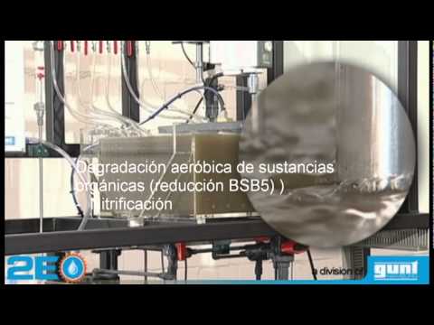 DescripciónEl proceso de lodos activados es el proceso biológico más importante para el tratamiento de aguas. Con CE 705 se puede estudiar este proceso de forma ilustrativa.Una bomba transporta el agua bruta contaminada con sustancias orgánicas disueltas (substrato) al tanque de aireación. Los microorganismos aerobios (lodos Activados) existentes en el tanque de aireación aprovechan este substrato como fuente de alimento y lo degradan biológicamente. Dado que los microorganismos aerobios necesitan oxígeno, el agua bruta se airea en el tanque de aireación. El lodo activado y el agua bruta se mezclan con un mecanismo agitador. A continuación, el lodo activado se separa del agua depurada en un decantador secundario. Una parte del lodo activado vuelve al tanque de aireación (lodo de retorno). El agua depurada se recoge en un depósito.También es posible la transformación de amonio en nitrato (nitrificación) y la de nitrato en nitrógeno (desnitrificación). Con un tabique separador se puede establecer en el tanque de aireación una zona no aireada para la desnitrificación.Se pueden ajustar los siguientes caudales: agua bruta, lodo de retorno, recirculación interno para la desnitrificación previa y aire. La concentración de oxígeno, el pH y la temperatura se pueden regular.Se dispone de un software para el indicación de los estados operativos y la adquisición de datos. Un esquema de proceso muestra el estadooperativo actual de los distintos componentes y los datos registrados.Se pueden tomar muestras en todos los puntos relevantes. Par los ensayos se requiere de lodos activados de una estación depuradora de aguas residuales y tecnología analítica. Los parámetros recomendados son:- DBO5 (demanda bioquímica de oxígeno)- DQO (demanda química de oxígeno)- NH4 (amonio)- NO3 (nitrato)El material didáctico, bien estructurado, representa los fundamentos y guía paso a paso por los distintos ensayos.Contenido didáctico / Ensayos- Conocer el proceso de lodos activados- Modo de funcionamiento de los procesos de nitrificación y desnitrificación previa- Establecimiento de un estado de funcionamientoestable- Reconocer las siguientes magnitudes influyentes* relación de reflujo del lodo de retorno* relación de reflujo del recirculación interno* edad del lodo* carga másica* concentración de oxígeno, pH y temperatura* Estación depuradora de aguas residuales a escala de laboratorio1* Biodegradación aerobia de sustancias orgánicas 1* Nitrificación y desnitrificación previa