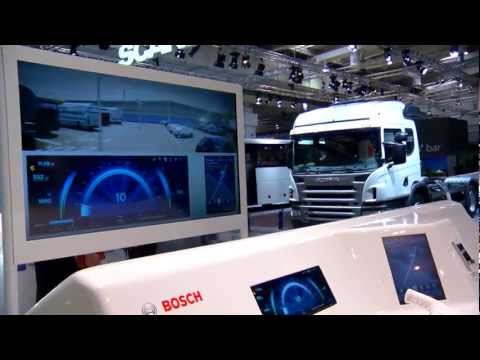 Bosch zeigt auf der IAA Nutzfahrzeuge 2012 eine Vision vom Arbeitsplatz der Zukunft. Die zunehmende Informationsvielfalt wird über frei konfigurierbare Displays dargestellt. Dank Komfort- und Sicherheitsfunktionen, wie die Warnung vor Stauenden oder die Empfehlung von Rastplätzen mit gleichzeitiger Reservierung von Parkflächen, kann der Fahrer von Nutzfahrzeugen sich auf das Wesentliche konzentrieren - nämlich das Fahren.