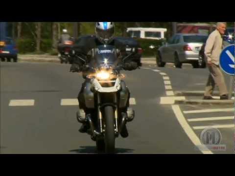 Un coche y una moto están a punto de colisionar cuando, de repente, un detector avisa de la situación y el conductor frena a tiempo.